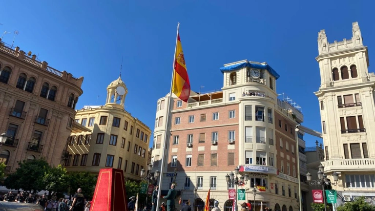 La bandera de España ya ondea en la plaza de las Tendilla junto a la estatua del Gran Capitán. Ha sido el primer acto de las fiesta de la patrona de la Guardia Civil que este año acoge la ciudad de Córdoba.
