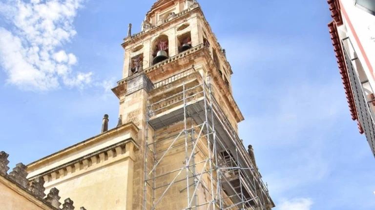 Instalan andamios en la Torre Campanario de la Mezquita-Catedral tras el desprendimiento de una cornisa