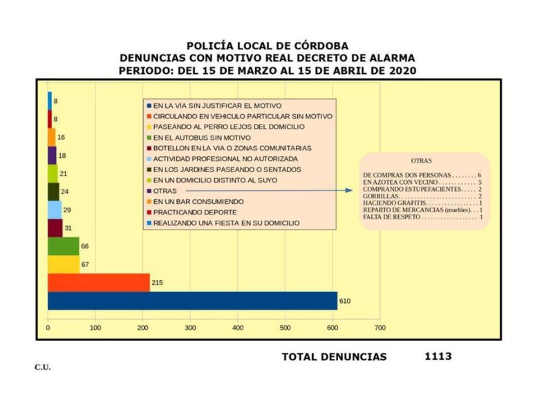 Acerca de los principales motivos de las denuncias formuladas por la Policía Local de Córdoba, más del 50% de las infracciones tuvieron como causa estar en la vía pública sin justificación (610), seguidas por desplazamientos no justificados en el vehículo particular (215), pasear al perro lejos del domicilio (67), así como el uso del transporte público sin poder justificar el motivo de ese desplazamiento (66 infracciones).