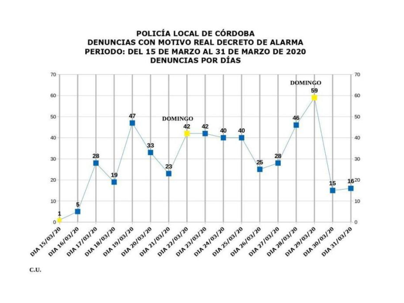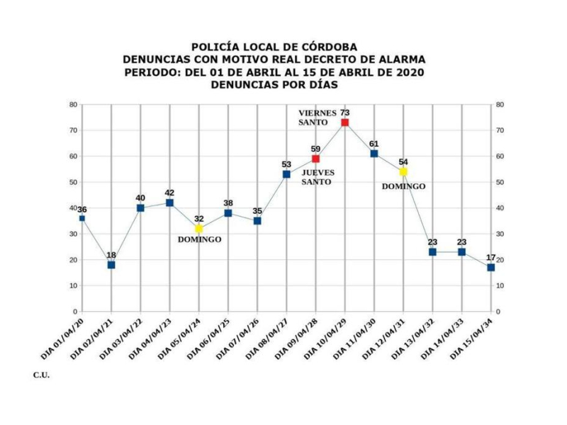 Los datos de la distribución temporal de las denuncias de la Policía Local de Córdoba muestran una mayor incidencia durante la primera quincena de abril, en la que se acumularon un total de 604 infracciones, frente a las 509 que se impusieron en la segunda quincena del mes de marzo, fecha de la entrada en vigor de las medidas planteadas por el citado Real Decreto de Estado de Alarma.