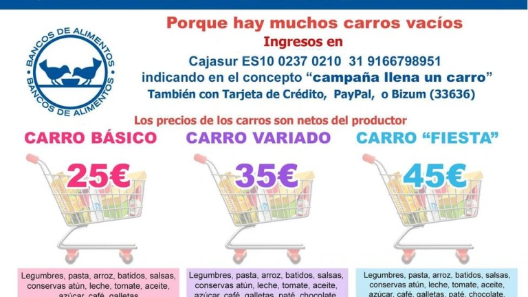 Para ayudar en esta campaña, la entidad ha dispuesto la cuenta Cajasur ES10 0237 0210 3191 6679 8951, en la que indicando se pueden realizar ingresos con el concepto 'Campaña llena un carro'. Igualmente, se puede colaborar a través de PayPal y Bizum.