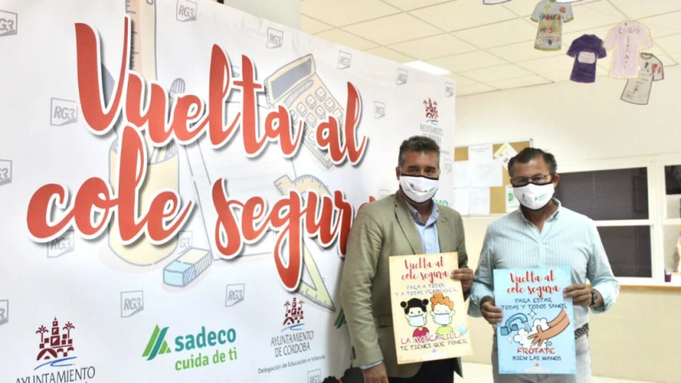 El teniente de alcalde delegado de Infraestructuras y presidente de la empresa municipal Saneamientos de Córdoba (Sadeco), David Dorado (Cs), y el delegado de Educación e Infancia del Ayuntamiento de Córdoba, Manuel Torrejimeno (Cs), han informado este miércoles de la campaña para la vuelta al cole, en la que desde Sadeco se reparten 22.000 mascarillas reutilizables para todos los niños de Primaria de "todos los colegios de la ciudad, sin distinción de que sean colegios privados, públicos o concertados", así como a profesores.