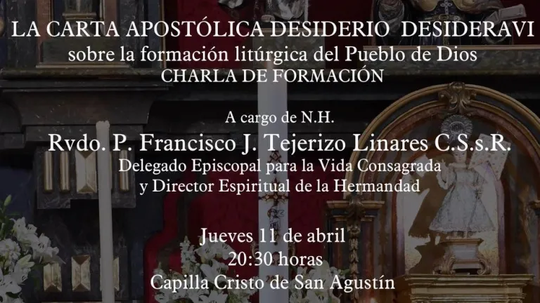 La Cofradía de Cristo de San Agustín ha convocado una “Charla de Formación" dedicada a la Carta Apostólica del Papa Francisco sobre la formación litúrgica: Desiderio Desideravi”. Estará a cargo de Rvdo. D. Francisco Tejerizo Linares, Delegado Episcopal para la Vida Consagrada, y Director Espiritual de la hermandad.