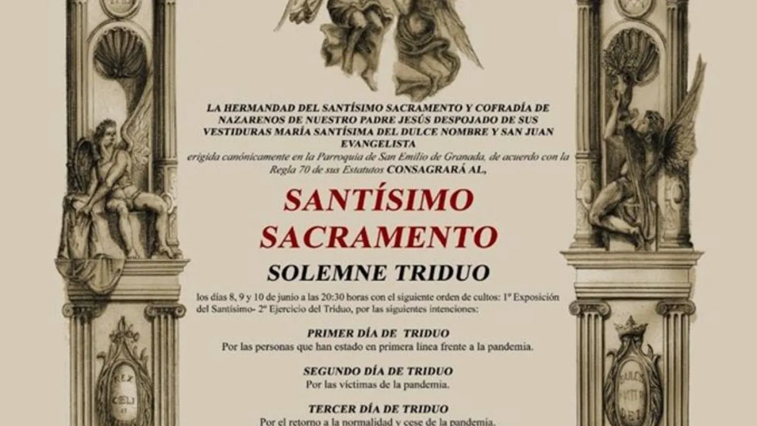 El Triduo que cada mes de junio celebra la Cofradía de Jesús Despojado al Santísimo Sacramento, se dedicará en esta ocasión al cese de la pandemia, a quienes están al frente de esta situación sanitaria, a las víctimas y al retorno a la normalidad. Cada una de estas rogativas estará presente en distintos días, de acuerdo con el cartel que acompaña esta información. La Hermandad de la Parroquia de San Emilio tiene como primer titular al Santísimo, dado su carácter sacramental. Fue además la protagonista del cartel que anunciaba la Semana Santa de 2020.