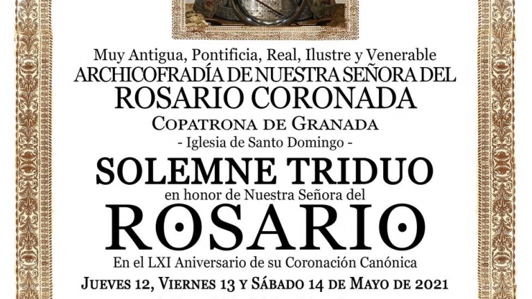 Este jueves 12 de mayo se inicia el Triudo que durante el mes dedica la Archicofradia del Rosario a la Virgen y que conemora el LXI Aniversario de la Coronación de su tituilar. Comenzará todos los días a las 19 h. con la Exposición del Santísimo Sacramento.. Después tendrá lugar el rezo del Santo Rosario a las 19,15 h. y la Santa Misa, a las 20,00 h. La predicación estará a cargo de Fray Antonio Larios Ramos, O.P., Prior del Convento de Santa Cruz la Real y Director Espiritual de la corporación.