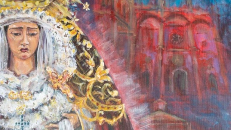 La Cofradía de la Lanzada ha dado a conocer su cartel de este año. Como informo COPE, se trata de una pintura de Carlos Alberto Marcos, que ya ha realizado trabajo similares para la corporación de la Parroquia de los Dolores. El autor ha convertido en protagonista a la Virgen de la Caridad, que aparece vestida como en lo hace para su salida procesional del Martes Santo. Con el azul del cielo ha querido representar el dogma de la Inmaculada Concepción y con el rojo de los templos que aparecen en la ilustración al Santísimo Sacramento y la Pasión de Cristo. De esta manera está presente el carácter sacramental de la cofradía. Son la Catedral, a la que cada año realiza estación de penitencia la hermandad, la Parroquia de los Dolores, su sede canónica, y el Hospital de San Juan de Dios, dada la vinculación de esta asociación de fieles con la Orden Hospitalaria. A los pies se sitúa varias granadas y sobre ellas, también una cruz, con lo que vuelve a estar representada los mencionada orden. Junto a ellas las orquídeas, que en tantas ocasiones forman parte del adorno floral del palio de la Caridad y que evoca que el pintor también suele actuar como florista en el montaje de algunos pasos.