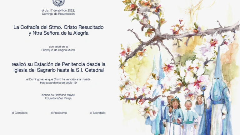 Según la corporación “ ha sabido traducir el sentimiento con que este Domingo de Resurrección se pondrá en la calle el cortejo blanco y celeste: la confianza en el resurgir de la Alegría y de la Vida. El almendro en flor, que enmarca el Misterio, cobija en esta obra a los nazarenos y campanillos del Resucitado, simbólicamente presente en ese árbol. Después de dos años en espera y en esperanza, la vida se impone a la muerte, la alegría al dolor y la amargura. Para la hermandad, es un orgullo poder contar con una obra tan meritoria estéticamente y tan significativa de su espíritu, por lo que desde aquí agradecen a María Victoria Jáimez su realización y la felicitan por la inspiración que ha guiado sus pinceles”.