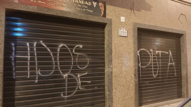 La Cofradía de los Ferroviarios detectaba el pasado sábado unas pinturas ofensivas en el portón de acceso al patio de la Parroquia de San Juan de Letrán, que reformó a principios de siglo para poder realizar una salida en mejores condiciones. Este domingo ha sucedido lo mismo, en este caso en su Casa de Hermandad, sita en la calle Mirlo. Según su hermano mayor, Oscar Jiménez, hay algunas cámaras cercanas en cajeros y en un edificio público que pueden ayudar a identificar a su autor.
