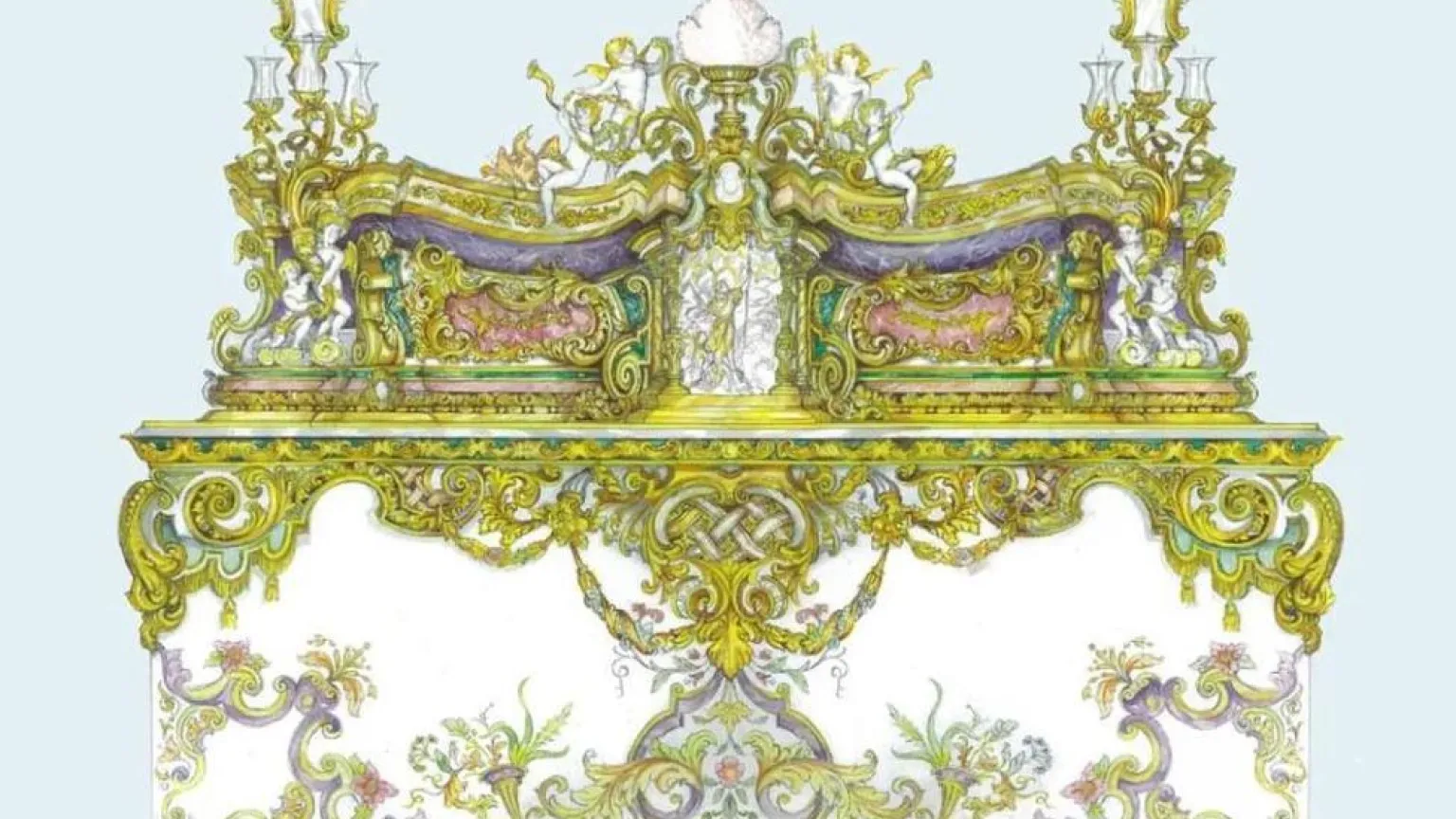 Los faldones se confeccionarán en damasco blanco, con bordados del tipo repostero, técnica que se utilizó durante el Barroco, con motivos decorativos vegetales y florales, con referencias a los elementos de la unción.