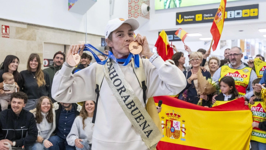 La doble medallista en esquí de montaña es recibida por familiares y amigos en el aeropuerto de Granada tras su éxito en los Juegos Olímpicos de Milán-Cortina d'Ampezzo