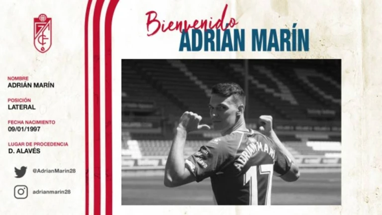 El lateral izquierdo Adrián Marín ya oficialmente nuevo jugador del Granada. Queda ligado al club hasta 2023. Tiene 24 años se formó en las filas del Villarreal. Además de en el equipo valenciano ha jugado una temporada cedido en el Leganés y en la temporada la temporada 2918-2019 firmó por tres años por el Alavés, donde este año acaba contrato. Ha sido internacional en categorías inferiores. Su debut en Primera División, con 17 años, fue precisamente en un partido que el Villareal disputaba frente al conjunto rojiblanco.