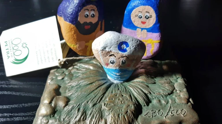 La Federación de Andaluza de Belenistas, a través de la Asociación de Amigos del Belén de Granada, ha distinguido a COPE GRANADA con uno de sus belenes Proyecto Petra. Esta iniciativa se lleva a cabo como reconocimiento a los colectivos y entidades que prestamos nuestro servicio en este “tiempo difícil de lucha contra la pandemia del COVID”. Por este motivo hemos tenido la oportunidad de recibir un Belén hecho a mano y en piedra, en el que se representa a la Sagrada Familia, con la particularidad de que el Niño Jesús aparece con una mascarilla. Además esta figura central de la escena luce el logo de la CADENA COPE. La elección de la piedra obedece, según comentan los responsables del Proyecto PETRA, a su carácter “humilde y a la vez noble”.