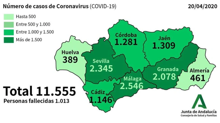 El número de contagiados por coronavirus en Andalucía se eleva a 11.555 casos, 130 más que ayer domingo, un 1,13 % más, y los fallecidos suben a 1.013, 20 más que ayer, 2,01 % más, según los datos de la Consejería de Salud.