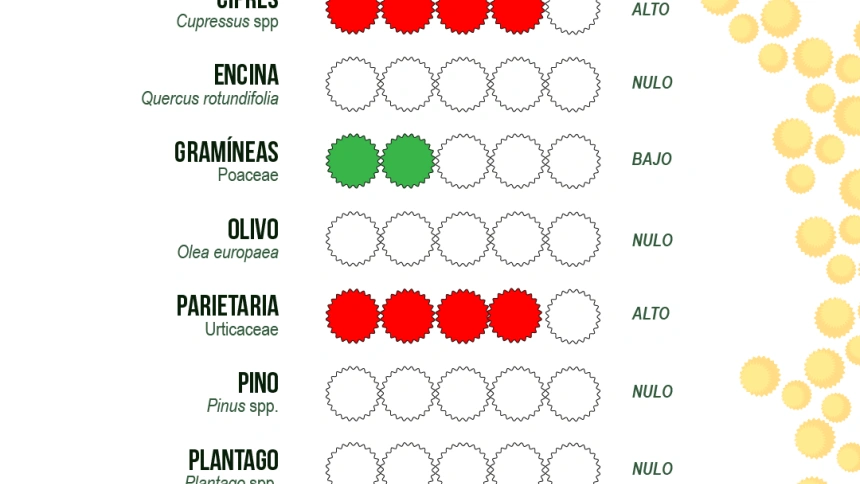 La floración de los cipreses, que se había retrasado este año, se ha reactivado y se espera que sus niveles de polen alcancen valores extremos durante este fin de semana. Al mismo tiempo, el polen de las parietarias se encuentra en niveles moderados, pero con una clara tendencia al alza, por lo que se recomienda a las personas alérgicas que tomen precauciones.