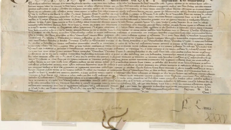 Sobre su materialidad, se ha identificado el origen animal del pergamino empleado como soporte a partir del examen de la morfología y distribución de los folículos pilosos determinando el empleo de piel de cabra, así como la tinta negra utilizada en el cuerpo del texto, diferente en composición a la utilizada para las suscripciones ejecutadas al pie del documento. Su estado de conservación es bueno, con signos evidentes del sistema original de plegado, determinado por las marcas de dobleces y la suciedad de polución en el plano que estuvo más expuesto cuando el documento se encontraba cerrado. El sello de plomo conserva el cordón y no presenta signos evidentes de deterioro.