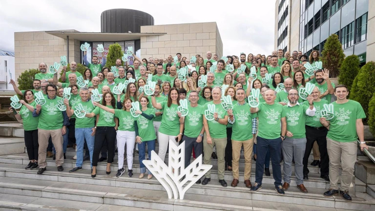 Para visibilizar la iniciativa, además de vestir una camiseta verde donde puede leerse 'Unidos somos más solidarios, sostenibles y comprometidos', los empleados se han realizado fotografías con una mano de cartulina con los dedos índice y corazón levantados como símbolo de paz.