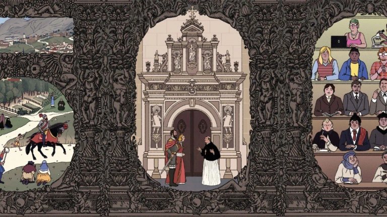 La ilustración de Candela Sierra propone un recorrido visual por momentos emblemáticos de la historia de la institución. En la pieza se entrelazan la sociedad del tiempo de Carlos V, la figura del emperador junto a Isabel de Portugal y la transformación de la UGR hasta su configuración actual como un espacio inclusivo y diverso.