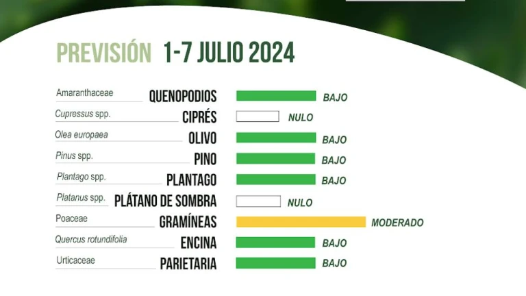 Las concentraciones de polen de olivos y gramíneas siguen registrando niveles moderados con una marcada tendencia al descenso por lo que la Unidad de Calidad Biológica del Aire UCBA-UGR da por finalizada la temporada de floración especialmente alergénica en la ciudad de Granada. Aun así, aquellas personas sensibilizadas a olivo, gramíneas, chenopodium o parietarias podrían continuar con síntomas si se encuentran cerca de este tipo de plantas.
