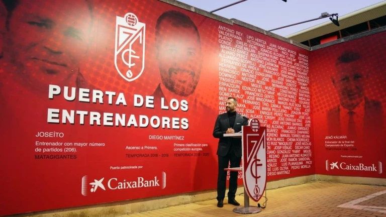 Una de las puertas del Nuevo Los Cármenes está decorada con las imágenes de los entrenadores más distinguidos de la historia del Granada. En ella figuran los nombres de Victoriano Santos, Kalmar, Joseito, Fabri o Lucas Alcaraz, y ahora también el de Diego Martínez. Esta tarde se ha inaugurado su presencia en este “Olimpo” de los técnicos, la llamada “Puerta de los Entrenadores”.