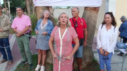 Vecinos de la urbanización Arenas de Poniente, en la playa de Motril (Granada), se han encadenado este lunes a una palmera para pedir al Ayuntamiento el cumplimiento de la ley de accesibilidad, de modo que puedan acceder al residencial los servicios de emergencias en caso necesario.