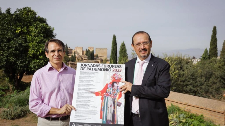 El delegado de Turismo, Cultura, y Deporte de la Junta en Granada, Fernando Egea, acompañado por el jefe de Servicio de Investigación y Difusión del Patronato de la Alhambra, Juan Salvador López, ha presentado el programa organizado con motivo de las Jornadas Europeas de Patrimonio 2023 con una decena de actos en distintos espacios culturales con la finalidad de que los ciudadanos se acerquen y conozcan la riqueza del patrimonio inmaterial de Granada.