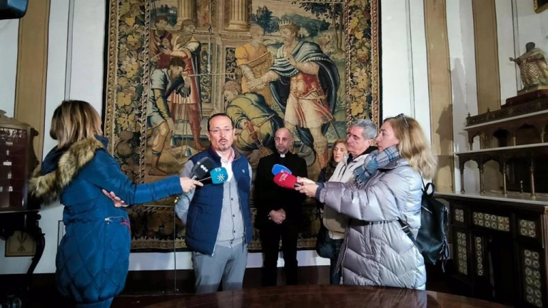 El delegado de Turismo, Cultura y Deporte de la Junta en Granada, Fernando Egea, acompañado del abad y delegado de Patrimonio de la archidiócesis, Antonio Fernández Siles, ha visitado la Abadía para comprobar el resultado de los trabajos de restauración del tapiz basado en la figura del Rey Ezequías pesando los tesoros que ha finalizado con un gran éxito.