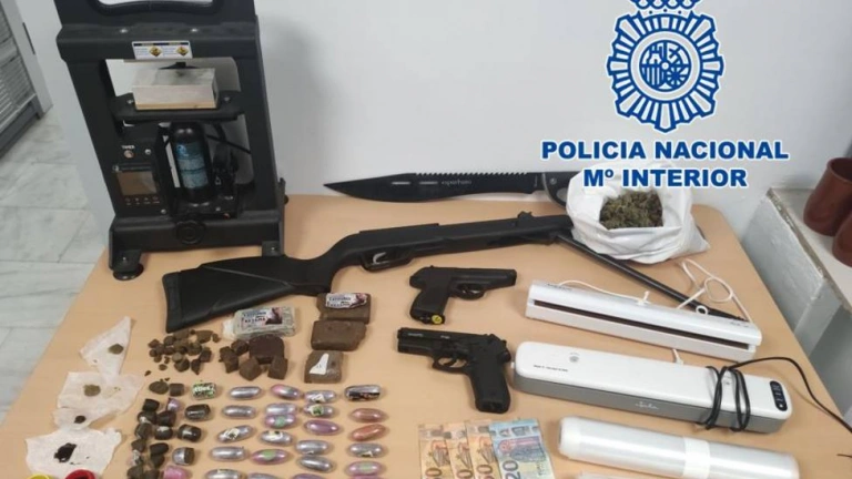 Durante el registro, los agentes se incautaron de dos armas cortas y una larga de aire comprimido, junto con un machete de 60 centímetros de hoja. Junto a todo esto se requisó material para la transformación y envasado de la droga tales como una prensa hidráulica, dos envasadoras al vacío y dos rollos de bolsas de plástico destinadas para este fin. Por último, los agentes confiscaron 170 euros en billetes.