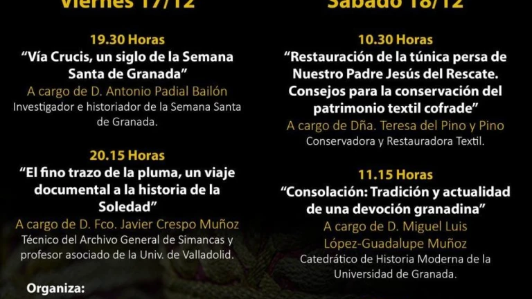 El sábado, 18 de diciembre, las presentaciones comenzarán a las 10:30 horas con la del libro de la Hermandad de Jesús del Rescate, bajo el título Restauración de la túnica persa de Nuestro Padre Jesús del Rescate. Consejos para la conservación del patrimonio textil cofrade, a cargo de la conservadora y restauradora textil, Teresa del Pino.