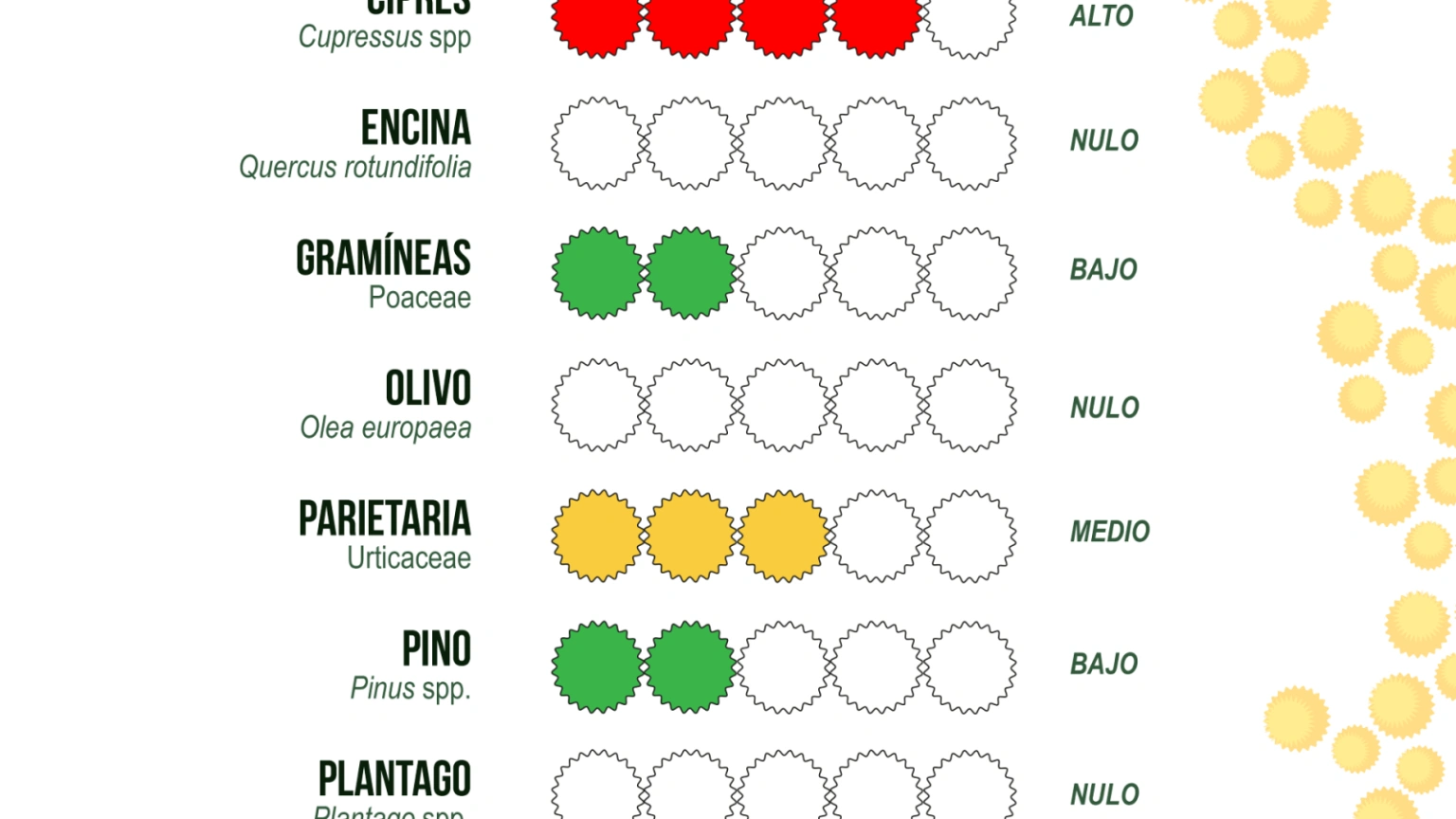 Las concentraciones de polen en Granada han experimentado un respiro. Los niveles de polen de ciprés y parietaria han descendido de forma notable, pasando de niveles extremos a moderados, debido a las precipitaciones y bajas temperaturas de los últimos días en la región.