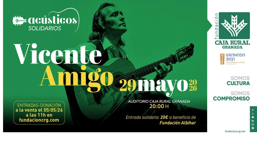 Vicente Amigo se ha incorporado al cartel de los Acústicos Solidarios de Fundación Caja Rural Granada con un concierto especial que tendrá lugar el próximo 29 de mayo en el Auditorio de la Entidad. El reconocido guitarrista presentará su gira Andenes del tiempo, un álbum que estuvo nominado a los Latin Grammy 2024, en una velada que combinará la excelencia musical y el compromiso social.