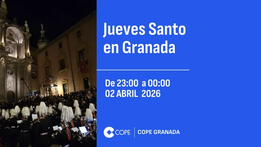Programación local en Granada JUEVES SANTO 23:00-00:00Leer másRedacción COPE Granada02 abr 2026, 00:00 - 60:00 minDescargarFacebookTwitterWhatsappTelegramEnviar por emailCopiar enlaceMás de Programación local en Granada VIERNES SANTO EN GRANADA 22:00-23:00 03 abr 2026, 23:00 - 60:00 MIN button_listen.placeholder VIERNES SANTO EN GRANADA 21:00-22:00 03 abr 2026, 22:00 - 60:00 MIN button_listen.placeholder VIERNES SANTO EN GRANADA 20:00-21:00 03 abr 2026, 21:00 - 60:00 MIN button_listen.placeholder VIERNES SANTO EN GRANADA 19:00-20:00 03 abr 2026, 20:00 - 60:00 MIN button_listen.placeholder VIERNES SANTO 18:00-19:00 03 abr 2026, 19:00 - 60:00 MIN button_listen.placeholder Ver todos Curiosa paradoja, ¿verdad? Que nos sintamos orgullosos del progreso de la raza humana a la vez que nos seguimos matando entre nosotros Rubén Corral Castellanos Lo último La Casa del Deán de Vegueta desvela sus secretos como la posible vivienda más antigua de Las Palmas 04 abr 2026, 06:00 7:35 min Viernes Santo en Granada: Las palabras del Arzobispo en el Campo del Príncipe, la liberación de un preso, el desprendimiento de una cornisa … 04 abr 2026, 04:12 3 min Un Viernes Santo para la historia en Córdoba: del Sepulcro a los Dolores 03 abr 2026, 23:11 2 min Horario y dónde ver y escuchar el Cádiz CF-Córdoba CF de la jornada 34ª de Liga Hypermotion 03 abr 2026, 23:06 1 min Un tremendo Reuvers impulsa a Valencia Basket a ganar en Bolonia y a rozar el sueño del playoff (81-90) 03 abr 2026, 22:27 3 min La Linterna Con Ángel Expósito Lunes a viernes de 19:00h a 23:30h Última hora completa ProgramasProgramas-Herrera en COPECon Carlos HerreraLunes a viernes de 06:00h a 13:00hProgramas-Tiempo de JuegoCon Paco González, Manolo Lama y Juanma CastañoSábados 13:00h-01:00h / Domingos 12:00h-01:30hProgramas-La LinternaCon Ángel ExpósitoLunes a viernes de 19:00h a 23:30hProgramas-El Partidazo de COPECon Juanma CastañoLunes a viernes de 23:30h a 01:30h Últimos audios CÓRDOBA PENITENTE, VIERNES SANTO HORA 6 03 abr 2026, 23:34 1 min VIERNES SANTO EN GRANADA 22:00-23:00 03 abr 2026, 23:00 1 min SEMANA SANTA EN COPE SEVILLA 03 ABRIL - VIERNES SANTO 4 03 abr 2026, 22:53 1 min CÓRDOBA PENITENTE, VIERNES SANTO HORA 5 03 abr 2026, 22:42 1 min VIERNES SANTO EN GRANADA 21:00-22:00 03 abr 2026, 22:00 1 min Último boletín 5:00H | 01 ABR 2026 | BOLETÍN 1 abr 2026, 05:35 Reproducir