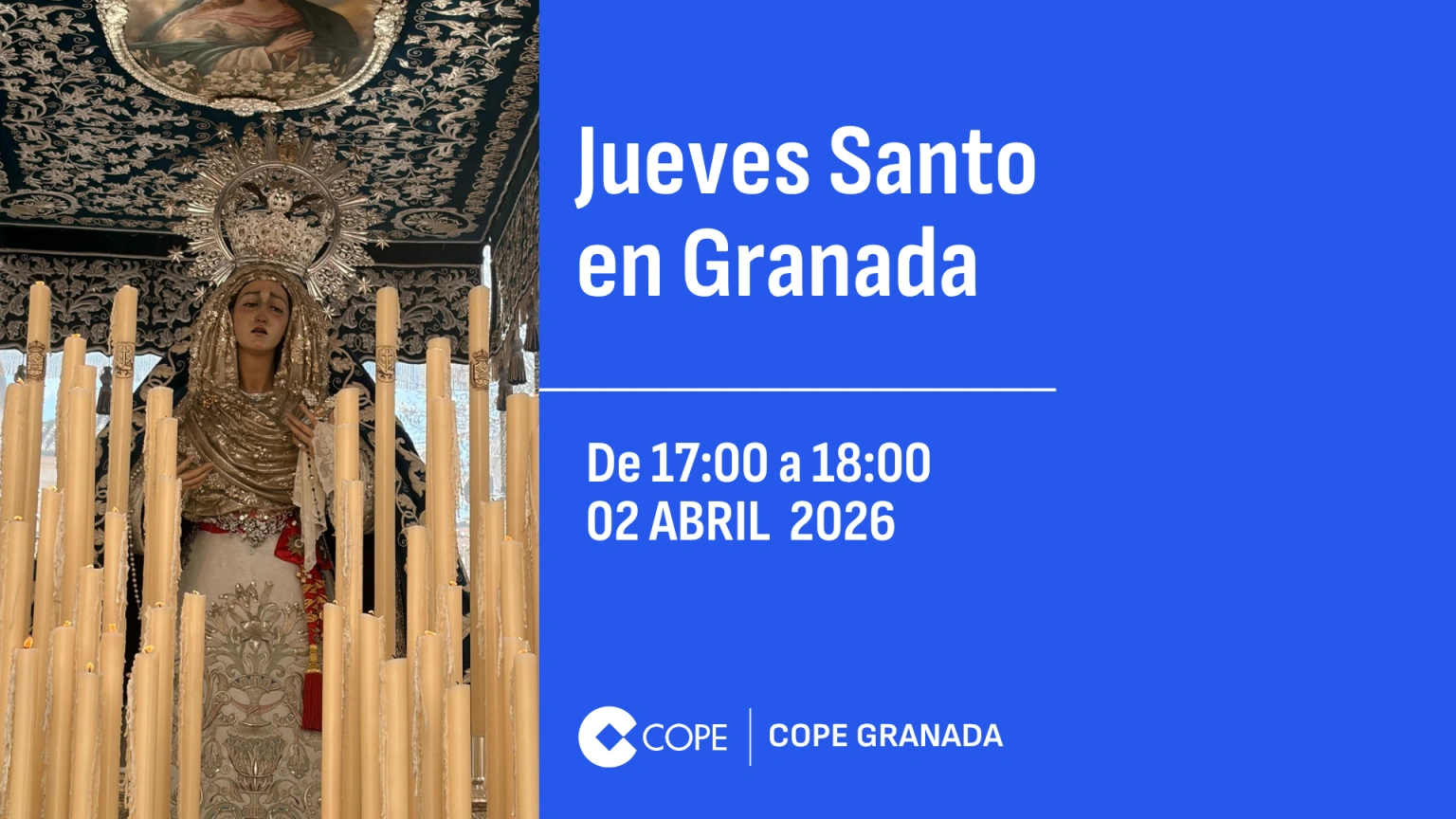 Programación local en Granada JUEVES SANTO EN GRANADA 17:00-18:00Leer másRedacción COPE Granada02 abr 2026, 18:00 - 59:59 minDescargarFacebookTwitterWhatsappTelegramEnviar por emailCopiar enlaceMás de Programación local en Granada JUEVES SANTO EN GRANADA 18:00-19:00 02 abr 2026, 19:00 - 60:00 MIN button_listen.placeholder MIERCOLES SANTO EN GRANADA 22:00-23:30 01 abr 2026, 23:00 - 90:00 MIN button_listen.placeholder MIERCOLES SANTO EN GRANADA 21:00-22:00 01 abr 2026, 22:00 - 60:00 MIN button_listen.placeholder MIERCOLES SANTO EN GRANADA 20:00-21:00 01 abr 2026, 20:00 - 60:00 MIN button_listen.placeholder MIERCOLES SANTO EN GRANADA 19:00-20:00 01 abr 2026, 20:00 - 60:00 MIN button_listen.placeholder Ver todos "Hoy, muchas cámaras estarán pendientes del Papa, de sus gestos y de sus palabras en su primera Semana Santa como máximo jerarca de la Iglesia católica" Pilar G. Muñiz Lo último Los pretendidos Wright y Francisco alejan al Barça del play off 02 abr 2026, 22:23 4 min Viernes Santo en Córdoba: siete hermandades entre la madrugada y la noche en el día más sobrecogedor 02 abr 2026, 21:00 0:54 min Aragón se vuelca con el libro infantil y juvenil: el plan para conquistar a los nuevos lectores 02 abr 2026, 18:13 25:17 min Épila entra en la élite: su Semana Santa ya es Fiesta de Interés Turístico de Aragón 02 abr 2026, 18:12 8:28 min 11 grúas y 180 trabajadores: Así avanzan las obras de la nueva Romareda, que se estrenará en otoño de 2027 02 abr 2026, 18:11 17:41 min La Linterna Con Ángel Expósito Lunes a viernes de 19:00h a 23:30h Última hora completa ProgramasProgramas-Herrera en COPECon Carlos HerreraLunes a viernes de 06:00h a 13:00hProgramas-Tiempo de JuegoCon Paco González, Manolo Lama y Juanma CastañoSábados 13:00h-01:00h / Domingos 12:00h-01:30hProgramas-La LinternaCon Ángel ExpósitoLunes a viernes de 19:00h a 23:30hProgramas-El Partidazo de COPECon Juanma CastañoLunes a viernes de 23:30h a 01:30h Últimos audios CÓRDOBA PENITENTE, JUEVES SANTO HORA 5 02 abr 2026, 22:50 1 min CÓRDOBA PENITENTE, JUEVES SANTO HORA 4 02 abr 2026, 21:38 1 min SEMANA SANTA EN COPE SEVILLA 02 ABRIL - JUEVES SANTO 4 02 abr 2026, 21:09 1 min CÓRDOBA PENITENTE, JUEVES SANTO HORA 3 02 abr 2026, 20:46 1 min SEMANA SANTA EN COPE SEVILLA 02 ABRIL - JUEVES SANTO 3 02 abr 2026, 19:53 1 min Último boletín 5:00H | 01 ABR 2026 | BOLETÍN 1 abr 2026, 05:35 Reproducir