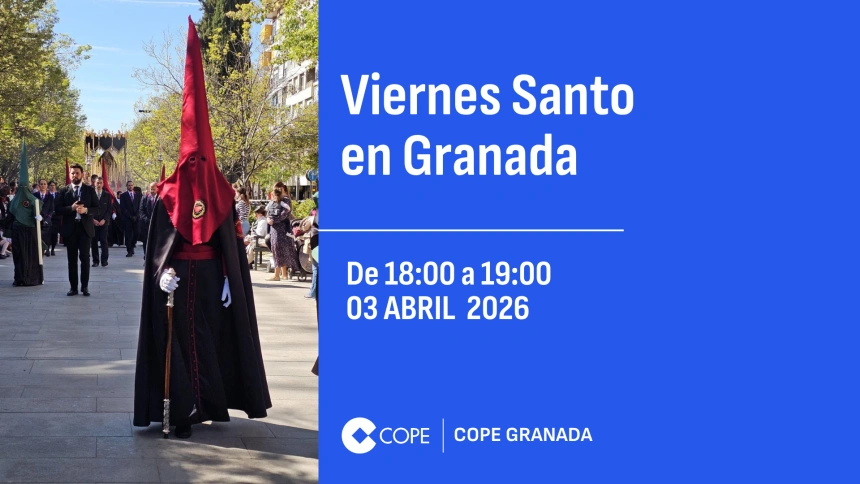 Programación local en Granada VIERNES SANTO 18:00-19:00Leer másRedacción COPE Granada03 abr 2026, 19:00 - 60:00 minDescargarFacebookTwitterWhatsappTelegramEnviar por emailCopiar enlaceMás de Programación local en Granada VIERNES SANTO EN GRANADA 22:00-23:00 03 abr 2026, 23:00 - 60:00 MIN button_listen.placeholder VIERNES SANTO EN GRANADA 21:00-22:00 03 abr 2026, 22:00 - 60:00 MIN button_listen.placeholder VIERNES SANTO EN GRANADA 20:00-21:00 03 abr 2026, 21:00 - 60:00 MIN button_listen.placeholder VIERNES SANTO EN GRANADA 19:00-20:00 03 abr 2026, 20:00 - 60:00 MIN button_listen.placeholder JUEVES SANTO EN GRANADA 22:00-23:00 02 abr 2026, 23:00 - 60:00 MIN button_listen.placeholder Ver todos Curiosa paradoja, ¿verdad? Que nos sintamos orgullosos del progreso de la raza humana a la vez que nos seguimos matando entre nosotros Rubén Corral Castellanos Lo último Un Viernes Santo para la historia en Córdoba: del Sepulcro a los Dolores 03 abr 2026, 23:11 2 min Horario y dónde ver y escuchar el Cádiz CF-Córdoba CF de la jornada 34ª de Liga Hypermotion 03 abr 2026, 23:06 1 min Un tremendo Reuvers impulsa a Valencia Basket a ganar en Bolonia y a rozar el sueño del playoff (81-90) 03 abr 2026, 22:27 3 min Un helicóptero rescata a un perro atrapado en el fondo del Cañón de Almadenes 03 abr 2026, 21:43 0:23 min Noche de fuego, fervor y tradición: La procesión de Granada que tienes que ver al menos una vez en la vida 03 abr 2026, 18:52 5:07 min La Linterna Con Ángel Expósito Lunes a viernes de 19:00h a 23:30h Última hora completa ProgramasProgramas-Herrera en COPECon Carlos HerreraLunes a viernes de 06:00h a 13:00hProgramas-Tiempo de JuegoCon Paco González, Manolo Lama y Juanma CastañoSábados 13:00h-01:00h / Domingos 12:00h-01:30hProgramas-La LinternaCon Ángel ExpósitoLunes a viernes de 19:00h a 23:30hProgramas-El Partidazo de COPECon Juanma CastañoLunes a viernes de 23:30h a 01:30h Últimos audios CÓRDOBA PENITENTE, VIERNES SANTO HORA 6 03 abr 2026, 23:34 1 min VIERNES SANTO EN GRANADA 22:00-23:00 03 abr 2026, 23:00 1 min SEMANA SANTA EN COPE SEVILLA 03 ABRIL - VIERNES SANTO 4 03 abr 2026, 22:53 1 min CÓRDOBA PENITENTE, VIERNES SANTO HORA 5 03 abr 2026, 22:42 1 min VIERNES SANTO EN GRANADA 21:00-22:00 03 abr 2026, 22:00 1 min Último boletín 5:00H | 01 ABR 2026 | BOLETÍN 1 abr 2026, 05:35 Reproducir