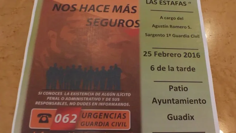 Ayuntamiento y Guardia Civil invitan a participar este jueves en la charla sobre estafas especialmente dirigida a los mayores La cita es este jueves 25 de febrero a las seis de la tarde en el Patio del Ayuntamiento con acceso libre para todo el que desee asistir Dar a los mayores en especial, y a toda la población en general, las claves para detectar una estafa y no caer en ella. Ese es el principal objetivo de la charla que Ayuntamiento y Guardia Civil han programado mañana jueves 25 de febrero a las seis de la tarde en el Patio del Ayuntamiento. La iniciativa se enmarca en el programa Plan Mayor Seguridad de la Guardia Civil que se coordina en Guadix con el Ayuntamiento y que este año se ha planificado anualmente. La programación prevé otra cita en verano para informar sobre cómo actuar para evitar robos en las viviendas, especialmente en esos meses en los que se quedan vacías durante varios días con motivo de las vacaciones. Y otra posterior sobre Internet y los riesgos que entraña. Este año se ha elegido el lema Tú colaboración nos hace más seguros al considerar que la colaboración ciudadana es fundamental. Esta primera charla será impartida por el Sargento 1º Agustín Romero, que abordará el tema de una manera amena y cercana, atendido las dudas que vayan surgiendo entre los asistentes. Desde el Ayuntamiento y desde la Guardia Civil se anima a la ciudadanía, en especial a los más mayores, a participar en ella y asistir este jueves a las seis de la tarde al patio del Ayuntamiento.