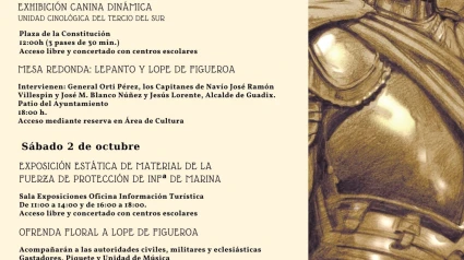 Este viernes dan comienzo las primeras actividades que se celebran el 1 de octubre y 2 de octubre en conmemoración del 450 aniversario de la Batalla de Lepanto y en homenaje al accitano Lope de Figueroa, una figura de especial relevancia en esa batalla, organizadas por el Ayuntamiento de Guadix en colaboración con la Armada Española y la Infantería de Marina. El programa previsto para este viernes 1 de octubre comienza con una exposición estática de material de la fuerza de protección de la Infantería de Marina en la Sala de exposiciones de la Oficina de Turismo en horario de 11:00 a 14:00 horas y de 16:00 a 18:00 horas con acceso libre y concertado con centros escolares. A continuación, habrá una exhibición canina dinámica a cargo de la Unidad cinológica del Tercio del Sur que tendrá lugar en la Plaza de la Constitución a las 12:00 horas (tres pases de 30 minutos) con acceso libre y concertado con centros escolares. La jornada finalizará con una mesa redonda sobre Lepanto y Lope de Figueroa que tendrá lugar a las 18:00 horas en el patio del Ayuntamiento. Participarán Juan Ortí Pérez, general de brigada de Infantería de Marina en situación de retiro, autor del libro “El maestre de campo Lope de Figueroa”, José María Blanco Núñez, el capitán de navío en situación de retiro y José Ramón Vallespín Gómez, capitán de navío en situación de reserva, moderados por Jesús Lorente, alcalde de Guadix. Para acceder a esta última actividad es necesario reservar plaza en el teléfono del Área de Cultura 958 66 29 95 de 11:00 a 13:00 horas o a través del correo electrónico cultura@guadix.es.