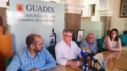 El alcalde de Guadix, Jesús Lorente, la concejala de Turismo, Ana Martínez Romero, el presidente de la Hermandad de la Virgen de la Piedad de Guadix, Juan López Lechuga, y el secretario de la misma, Francisco López, han dado a conocer esta mañana el acto de presentación del Cascamorras y los galardonados durante el mismo.