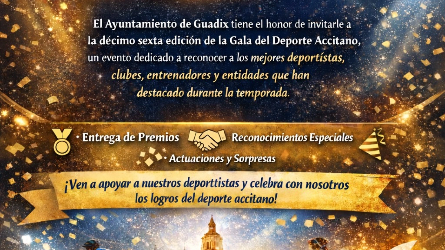 El mundo del deporte accitano se viste de largo el próximo viernes 13 de marzo para celebrar la XVI Gala del Deporte Accitano. El evento, organizado por la concejalía de Deportes del Ayuntamiento de Guadix, tendrá lugar en el teatro Mira de Amescua a las 20:00 horas con entrada libre hasta completar el aforo.