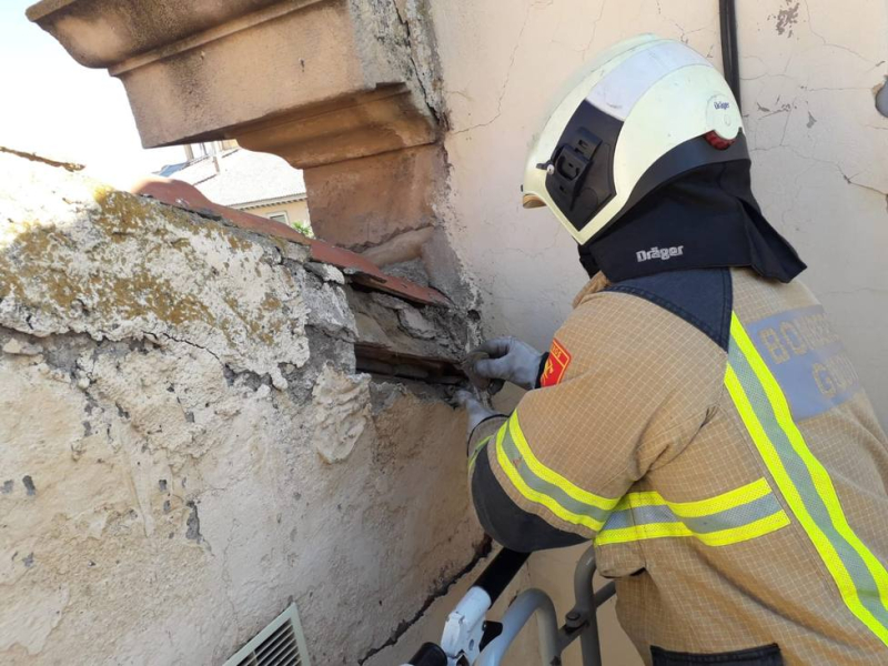 Los Bomberos de Guadix actúan en una fachada y una cornisa tras la caída de cascotes a la calzada