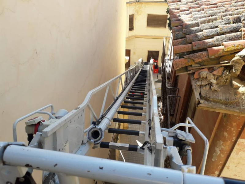 Los bomberos han procedido a realizar las labores de saneamiento de la fachada y cornisa visiblemente dañada, para evitar nuevos desprendimientos que pudieran causar daños mayores a los ciudadanos. Se ha desplazado una dotación hasta el lugar para realizar los controles pertinentes haciendo uso del camión escala.