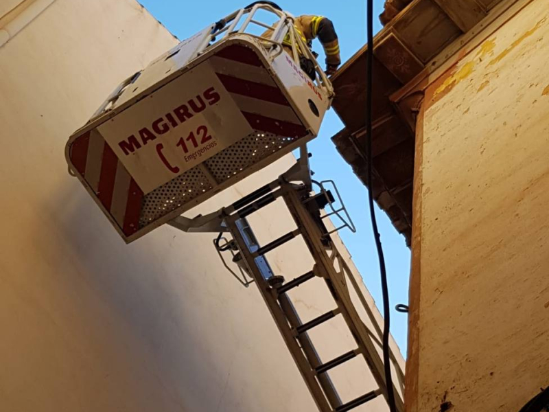 Los Bomberos han intervenido en la calle Santisteban junto a Magistral Domínguez ante el riesgo de desprendimiento en una cornisa