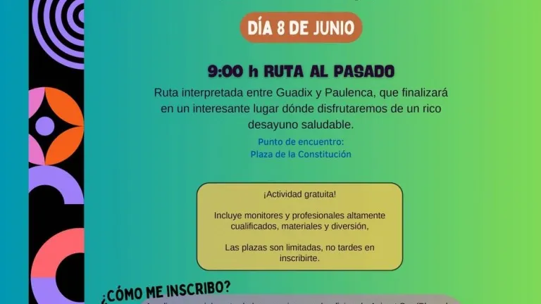 La concejalía de Juventud del Ayuntamiento de Guadix, representada por Sofía Aparicio, informa que se ha iniciado el plazo de inscripción para la actividad “Ruta al pasado”, otra actividad del programa municipal “Jóvenes activos en su comarca” de ocio y tiempo libre juvenil puesto en marcha por la concejalía de juventud. En concreto se trata de ruta interpretada entre Guadix y Paulenca, que finalizará en un interesante lugar dónde se disfrutará de un rico desayuno saludable. La actividad se realizará el próximo 8 de junio donde y pueden participar personas de 14 a 30 años.