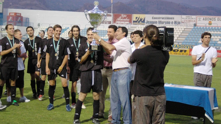 En la imagen, Salva, capitán del Teymo, recibe de manos de Felipe Villa, por entonces concejal de Deportes del Ayuntamiento de Motril, el trofeo que les acreditaba como campeones. Flanquean al edil Jesús Chinchilla, director del Área; y el incombustible Daniel Murúa. Junto a ellos, en primera línea, se encuentran varios jugadores Teymo como Raúl Cantón, José Antonio Chica, Pepillo o Manolo Ruiz.