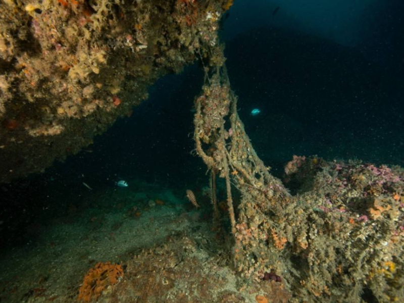 Restos de las cuerdas de las nasas forman un entramado sobre los corales y otros organismos a unos 30 m. de profundidad.