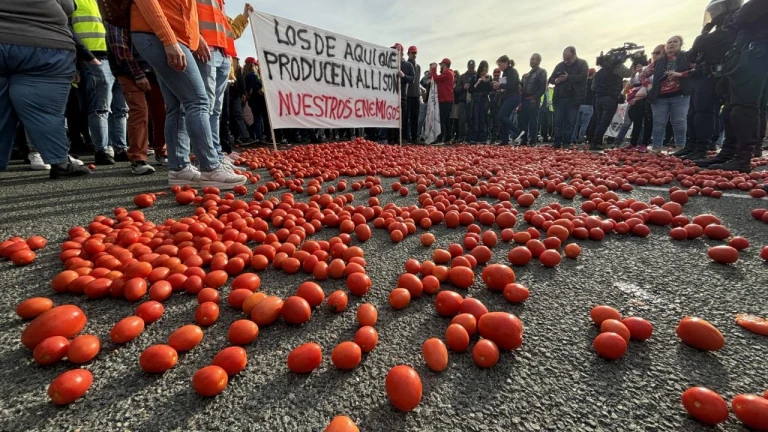 Cientos de agricultores vuelcan tomates en el acceso al Puerto de Motril como protesta