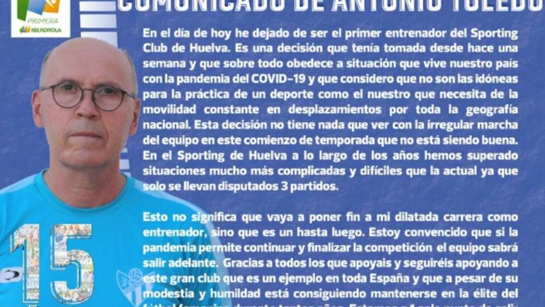 El Sporting Club de Huelva quiere informar de la dimisión como entrenador de Antonio Toledo Sánchez, que había comunicado con carácter irrevocable a la junta directiva el pasado jueves debido a la situación que vive el país debido a la pandemia de la COVID-19. Asimismo, el Sporting Club de Huelva agradece a Antonio Toledo sus años de trabajo desinteresado por este club que no solo fundó si no que ha llevado a sus más altas cotas de triunfo.