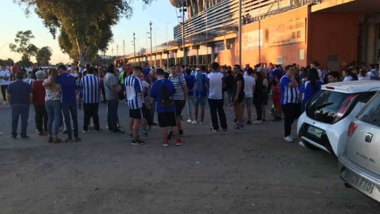 aficionados del Recre esperando al equipo a su llegada al Nuevo Colombino