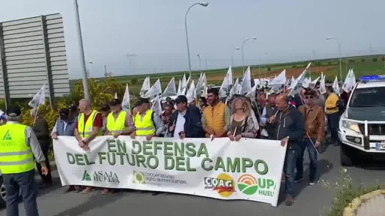 Unos 35 tractores de agricultores y ganaderos de la provincia de Huelva y 250 personas a pie, según datos de la Subdelegación del Gobierno, se manifiestan este lunes convocados por Asaja, COAG, Cooperativas Agro-Alimentarias y UPA, con el apoyo de Freshuelva y de la Asociación de Citricultores, por el futuro del sector, que aseguran que está "en duda", y por el "abandono secular" de la provincia "por parte de las administraciones" en "infraestructuras hidráulicas".
