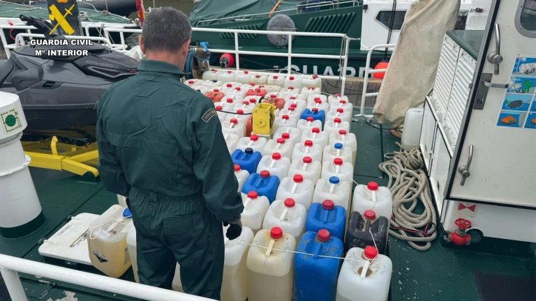 La Guardia Civil, durante la mañana de este miércoles, se ha incautado de tres embarcaciones rígidas cargadas con garrafas de gasolina, además de recuperar otras tantas que flotaban en el mar -unos 1.875 litros- frente a las costas de Mazagón e Isla Cristina (Huelva), cuyo destino sería el abastecimiento al narcotráfico.