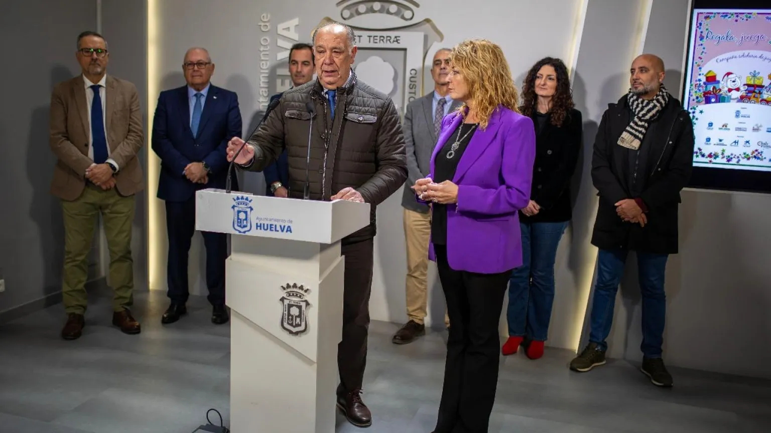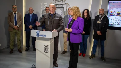 La alcaldesa de Huelva, Pilar Miranda; junto el presidente de Huelva Comercio, Antonio Gemio, ha presentado esta mañana en rueda de rensa la campaña ‘Regala, Juega, Sonríe’. Un acto que ha contado con la asistencia del concejal de Servicios Sociales, Familias y Accesibilidad, José Manuel Moreno; el director de la Cámara de Comercio, Arsenio Martínez; el director de Área de Negocio de CaixaBank en Huelva, Sergio Santos; el director general de la Fundación Atlantic Copper, Antonio de la Vega; la directora de Sostenibilidad de Aguas de Huelva, Natividad Moya; y el presidente de la Asociación de Comerciantes de La Merced, Román Domínguez.