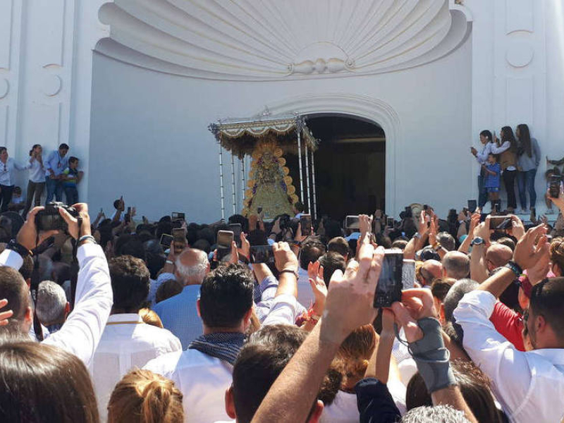 El momento está cargado de emoción pues las las hermandades desfilan, por orden de antigüedad, con su estandarte (conocido mayormente como “simpecado”), a las puertas de la ermita mientras se oye el repicar de las campanas y se suceden los cánticos dedicados a la Virgen.